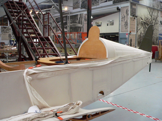Early stages of fabric covering on SE.5a fuselage.