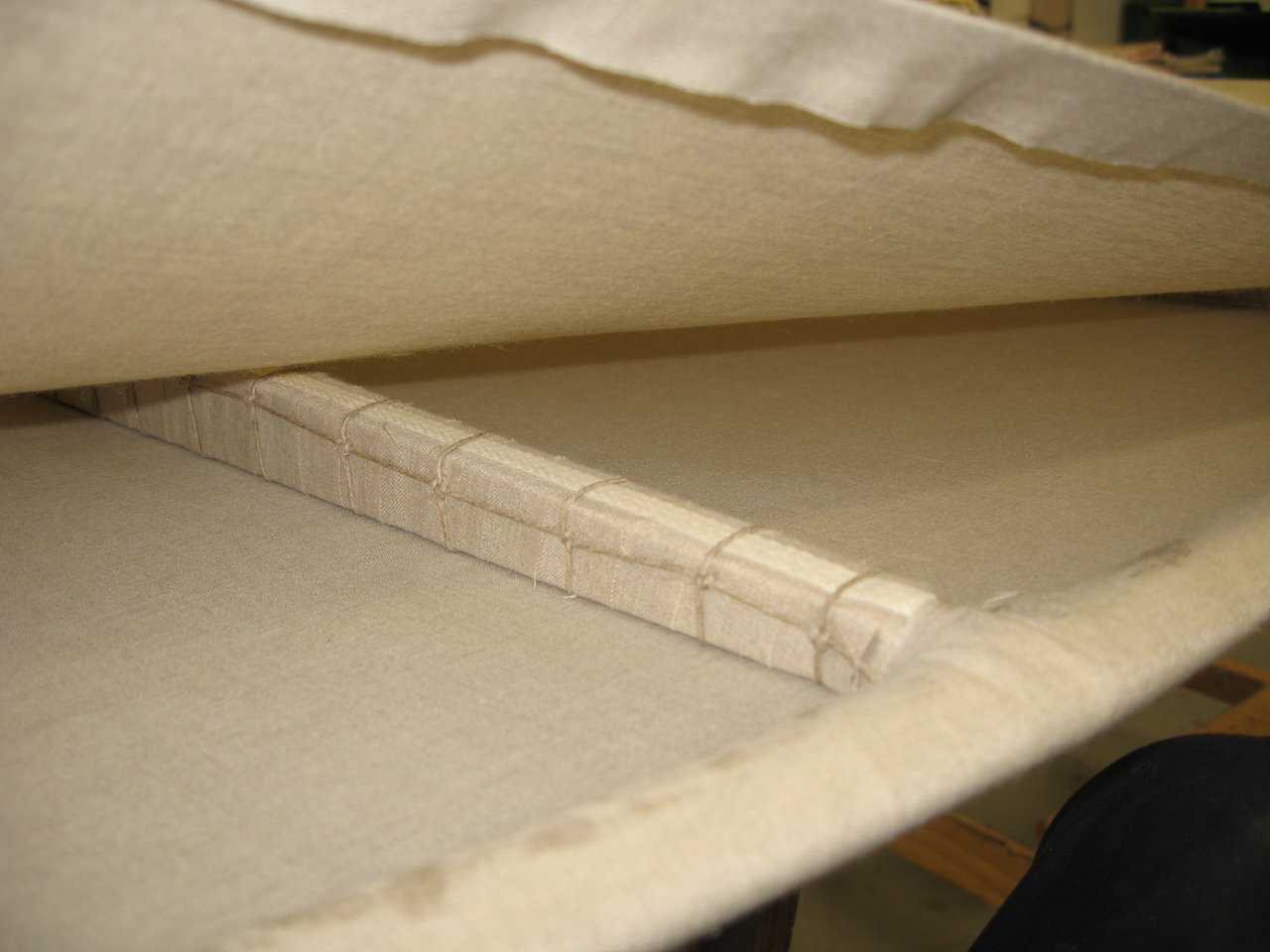 Looking under the top layer of fabric before its sewn onto the lower layer. Note rib with 6mm braided tape and linen cord.