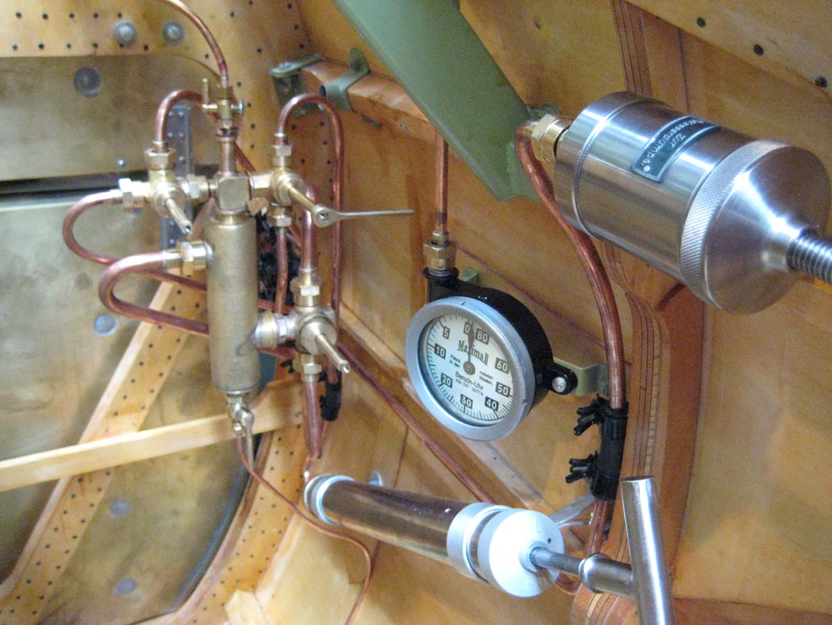 Cockpit plumbing, water pump greaser (upper right) , Fuel quantity gauge, and hand air pump (lower right)