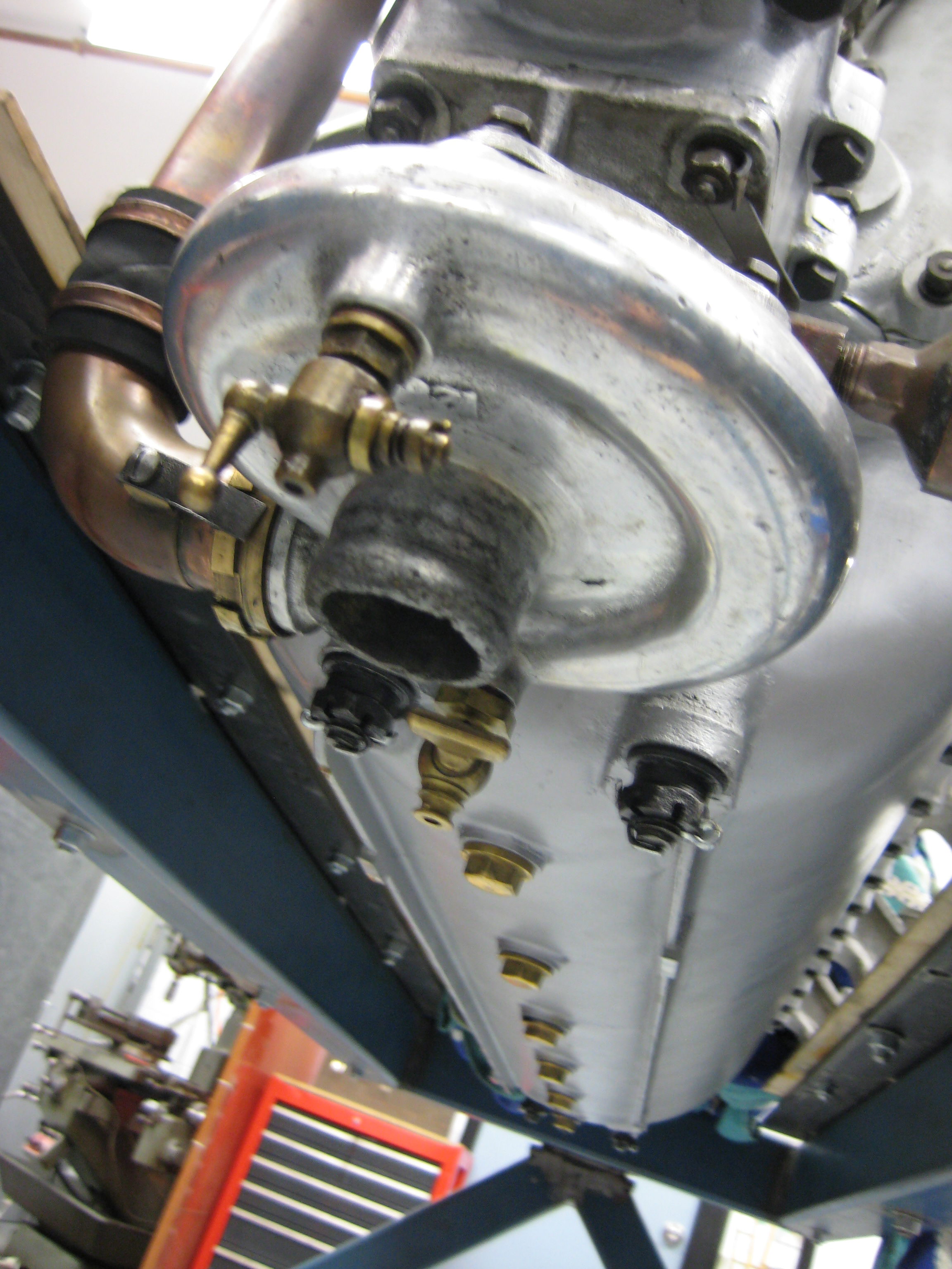 Lower crankcase detail, note sump drains and water pump