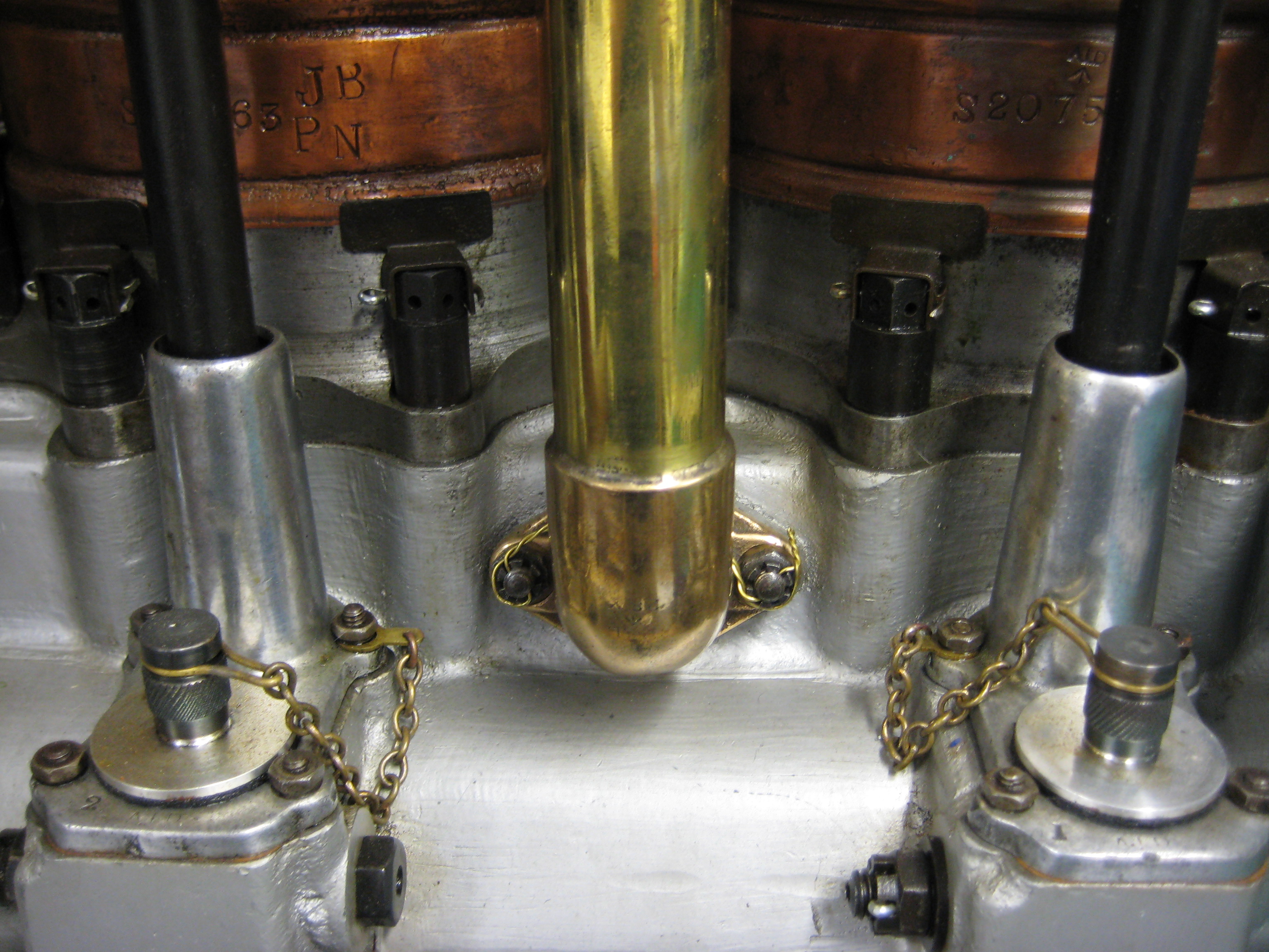 Crankcase detail, note oil fillers and brass breather tube
