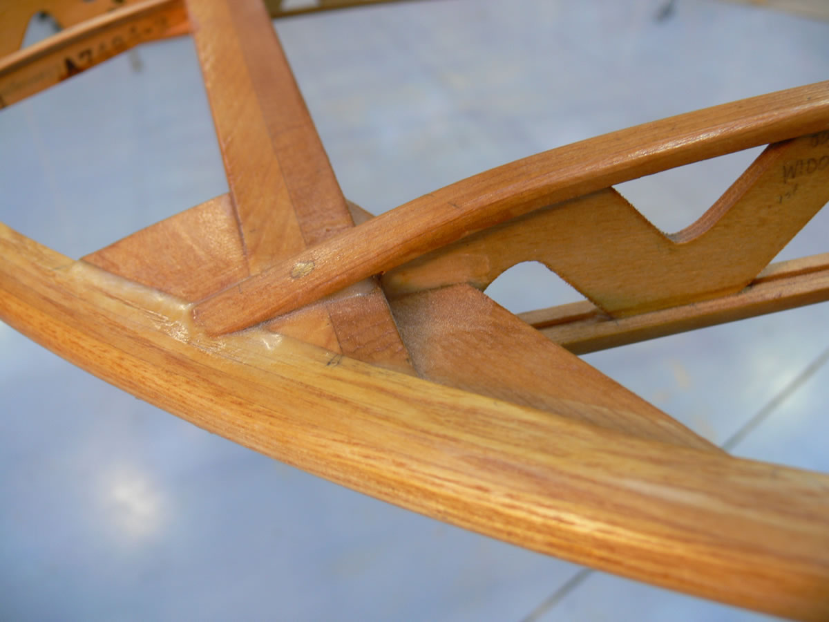 Close up of the wingtip assembly, the laminated ash tips are scarfed into the spruce leading edges, note the laminated front spar.