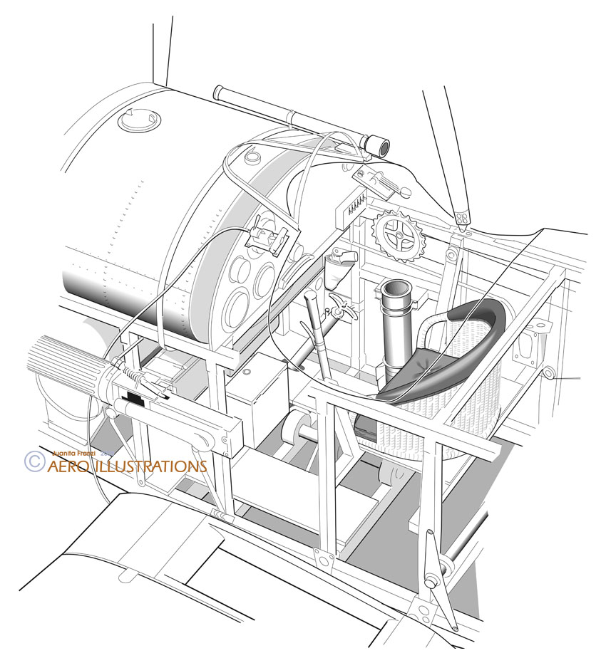 - Below that, the primer pump for the interrupter gear (Constantinesco synchronisation gear).