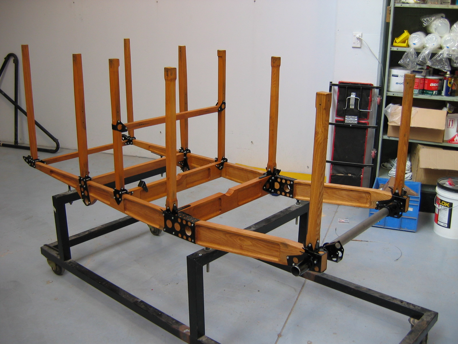 Ash lower longerons and mid fuselage metal fittings installed to begin fuselage assembly.