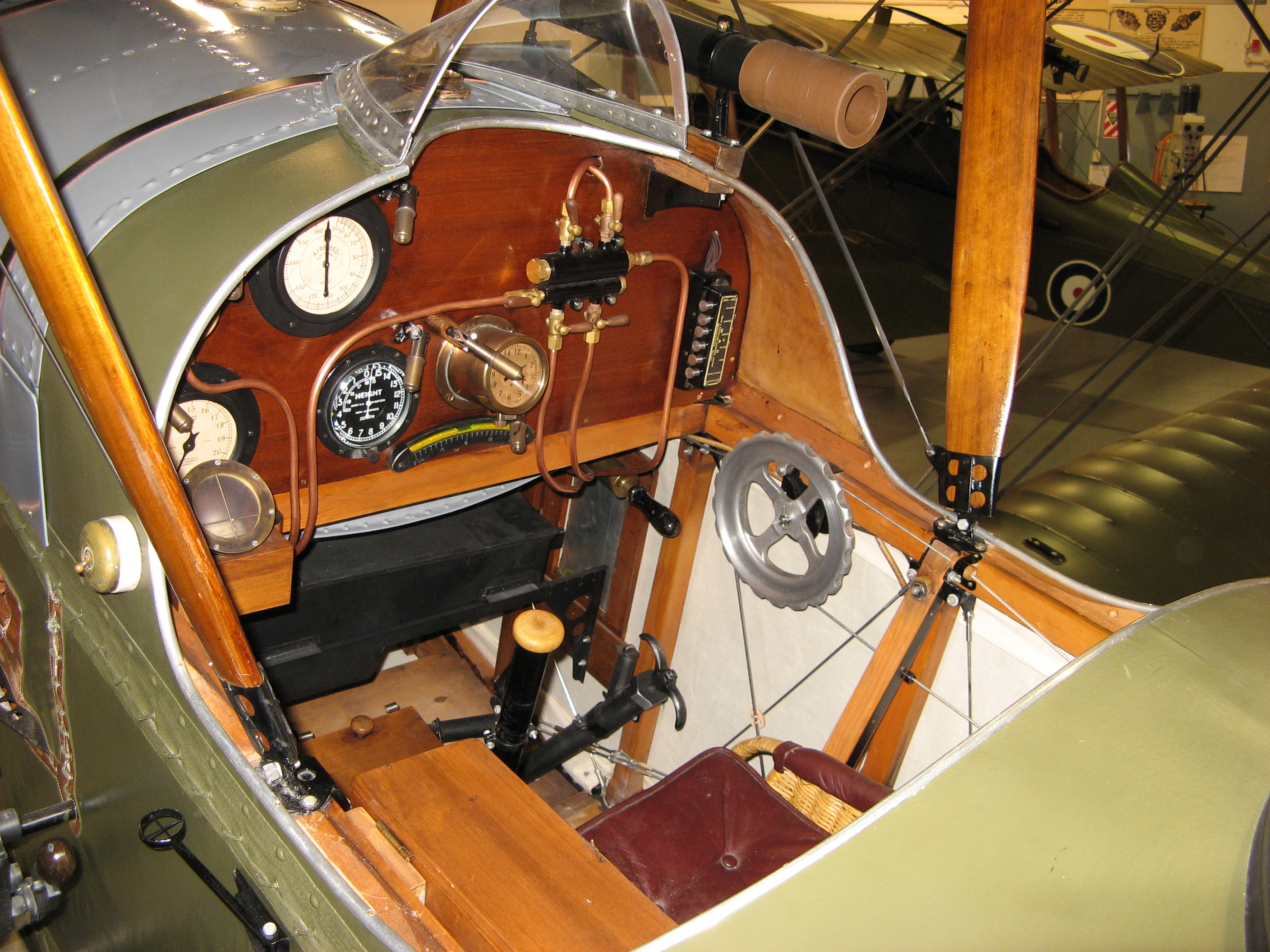 Cockpit detail showing elevator trim wheel wicker seat reproduction ammo box leather seat cushion constantinesco gear pump a