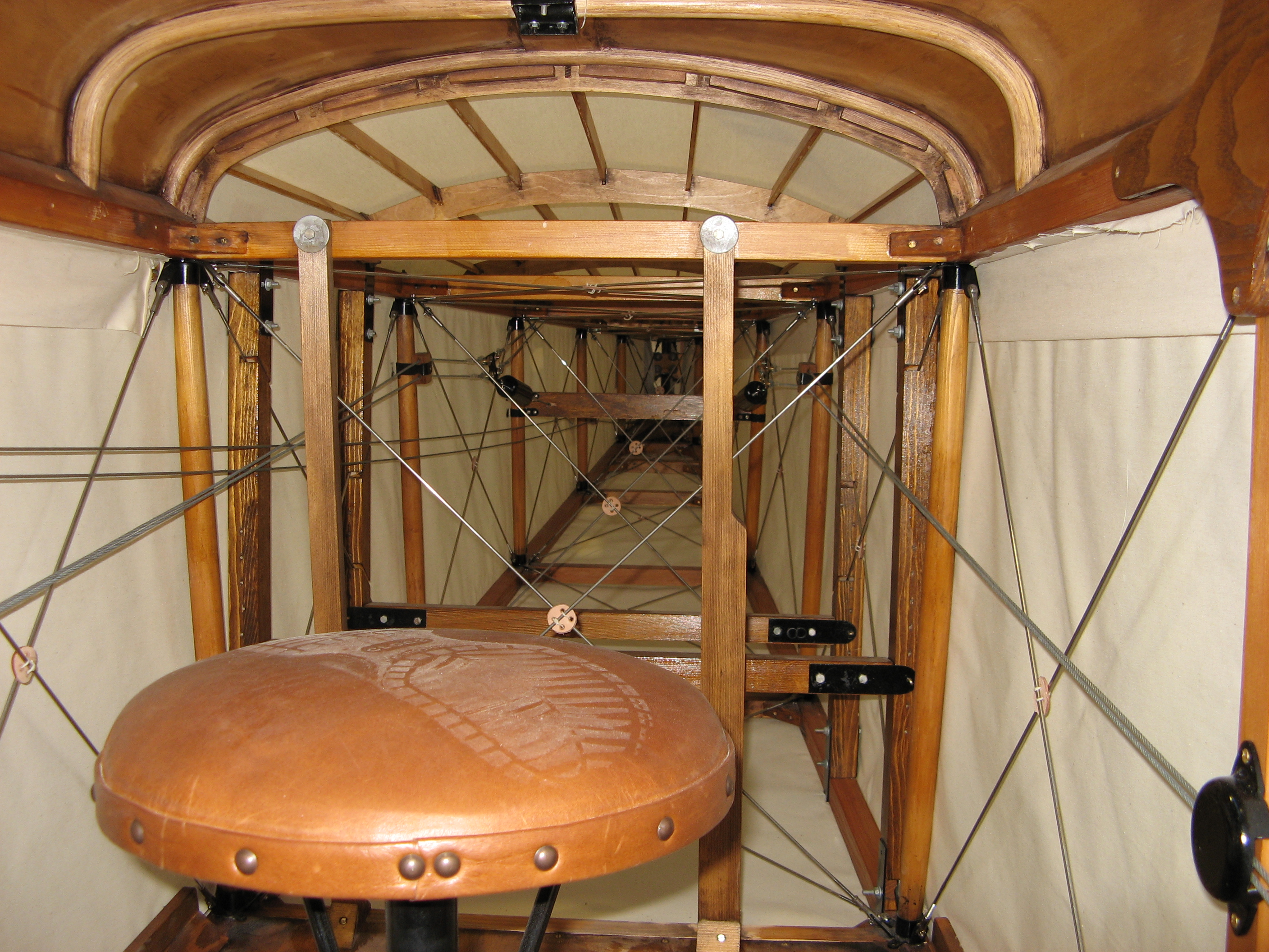View looking aft inside fuselage showing wire bracing linen covering and gunners seat.