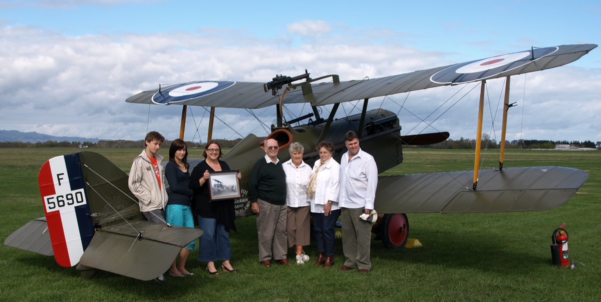 Left to right - Oscar Jackson, Georgia Jackson (Edward's children, Montie's grandchildren), Jane Jackson (Montie's eldest child, holding a photograph of the original plane), Montie Jackson, Diana Jackson (Montie's wife), Belinda Boness (Montie's second child) and Edward Jackson (Montie's third child)