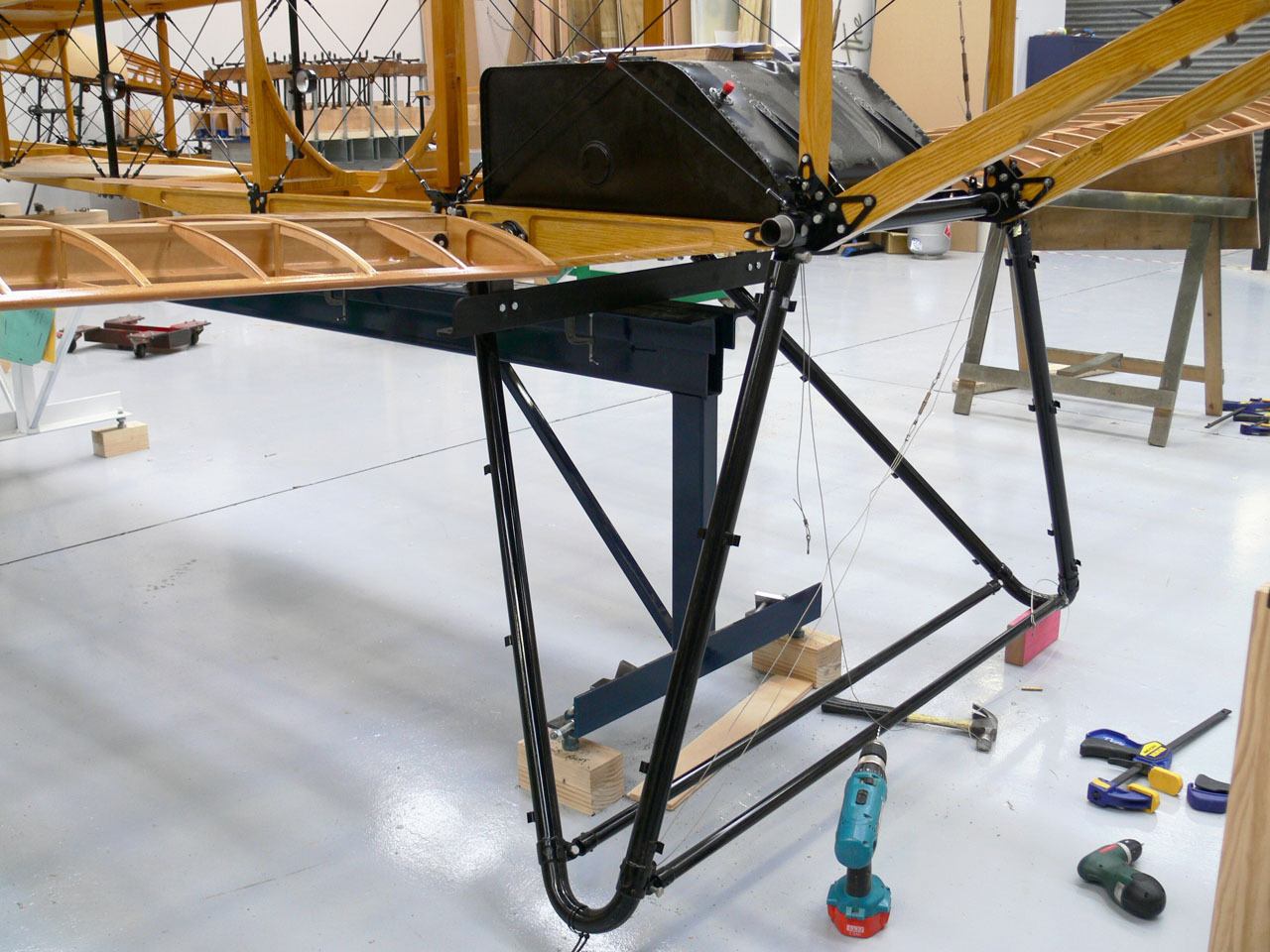 Trial fitting BE2c main landing gear and fuel tank