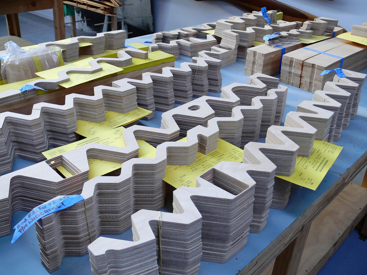 The accuracy of the CNC router is clearly visible here, with like rib webs stacked for inspection prior to assembly