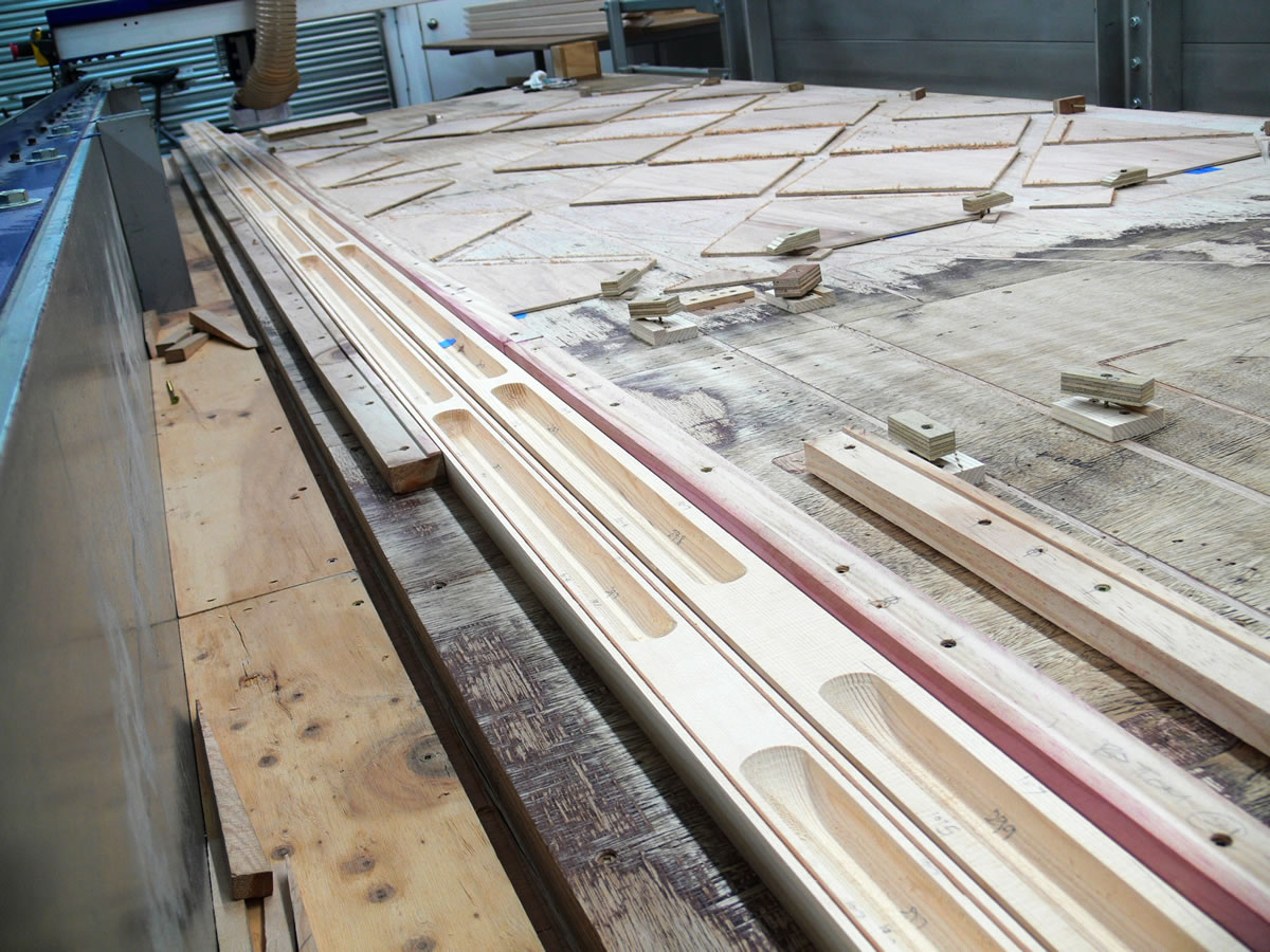 On the bed of our CNC router each half of a single outrigger has been hollowed out to reduce weight.