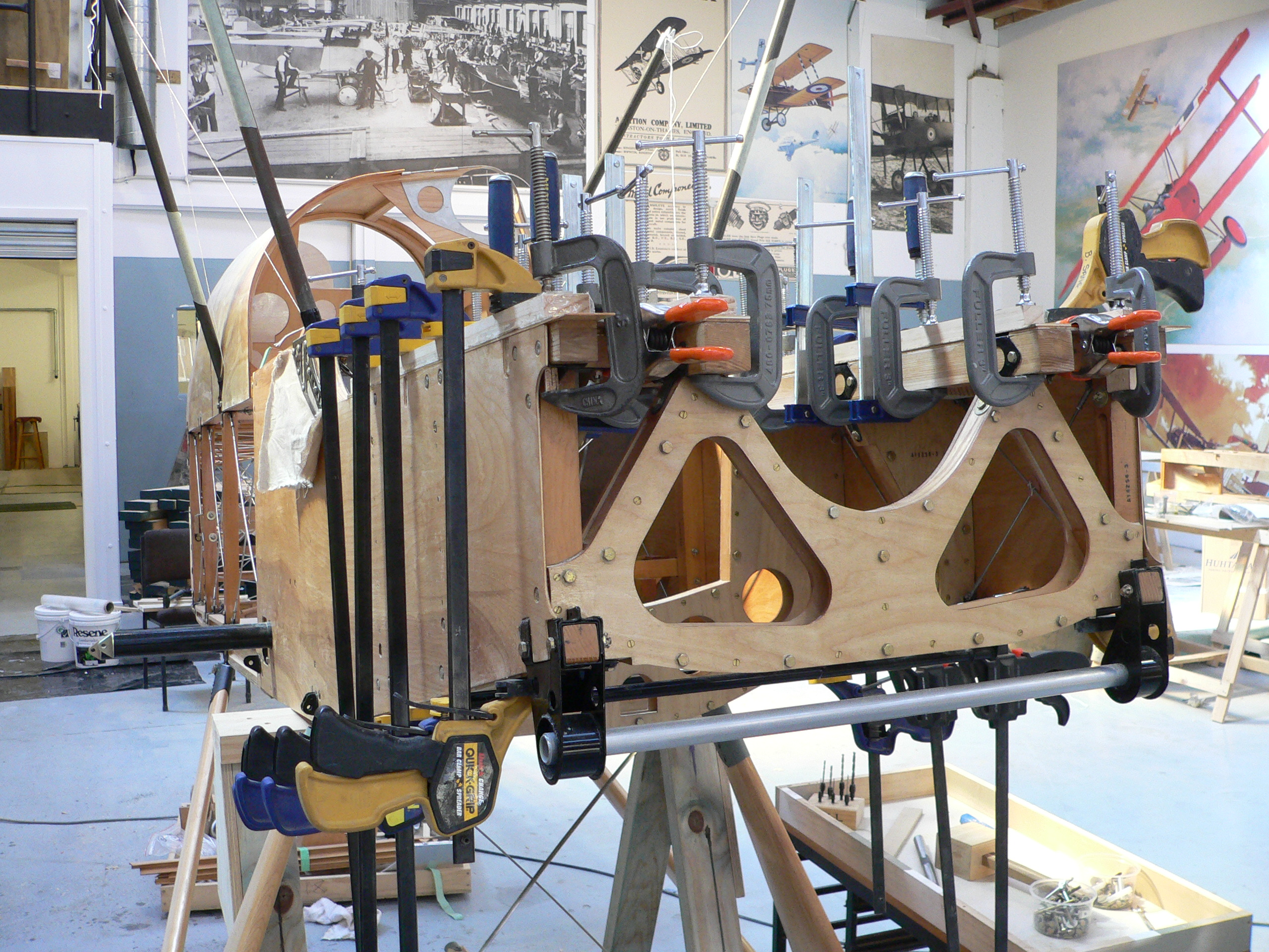 Gluing SE.5a engine bearer top plywood doubler in position.