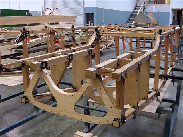 Gluing SE.5a engine bearer top plywood doubler in position.
