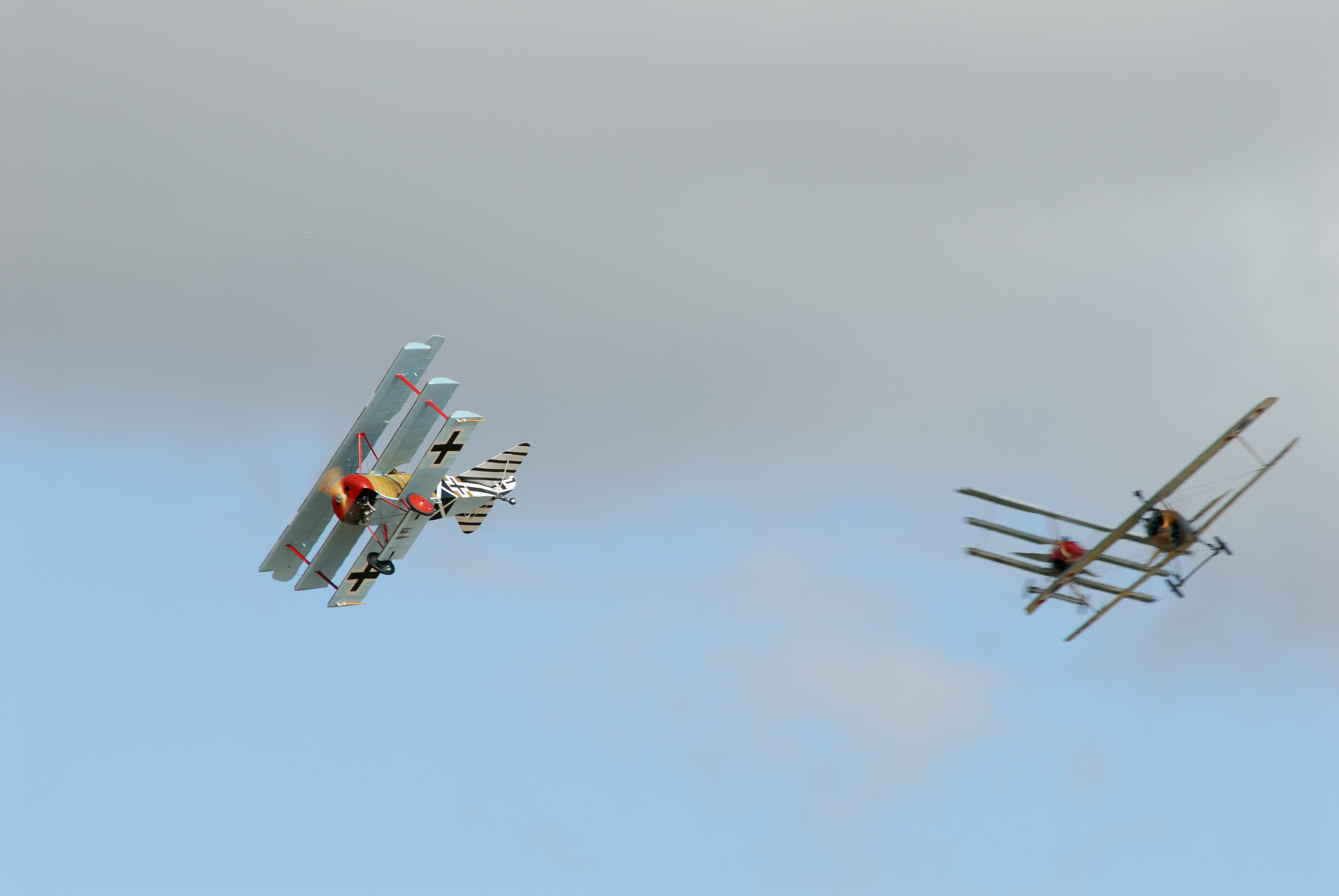 Tiny Nieuport trying to fend off two fokker triplanes