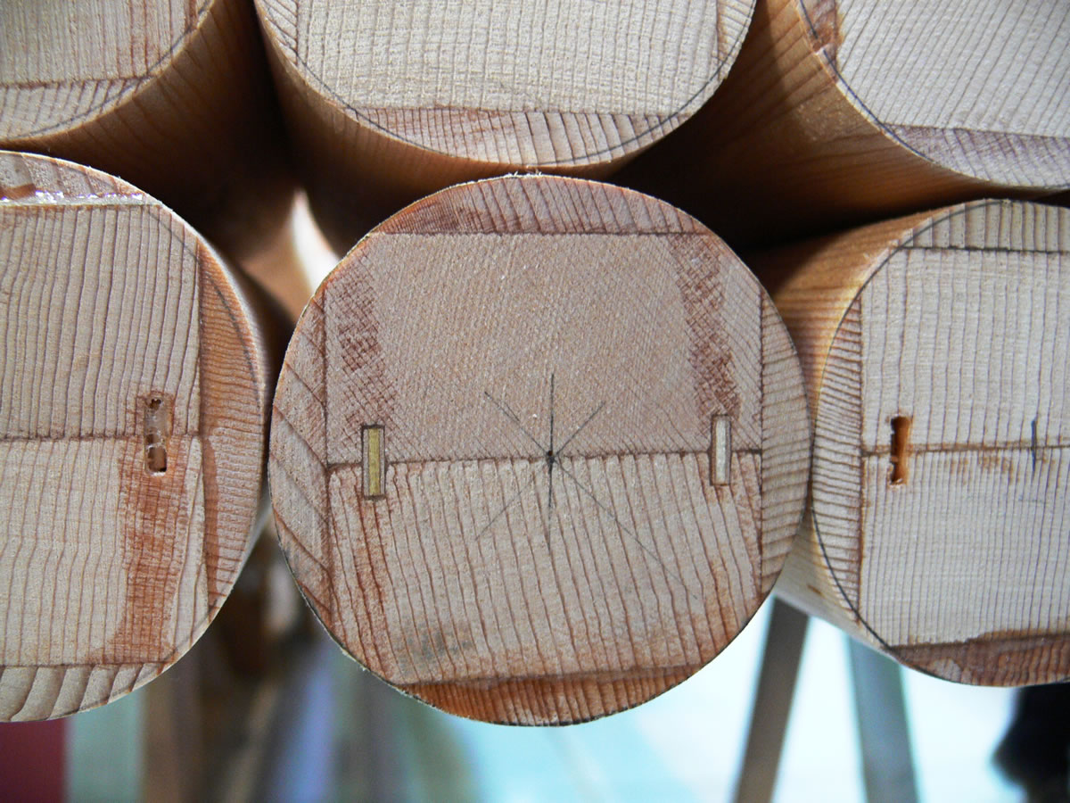 Detail of each outrigger, the routed halves are joined with a plywood spline and then packers are added to give the ends a round section.