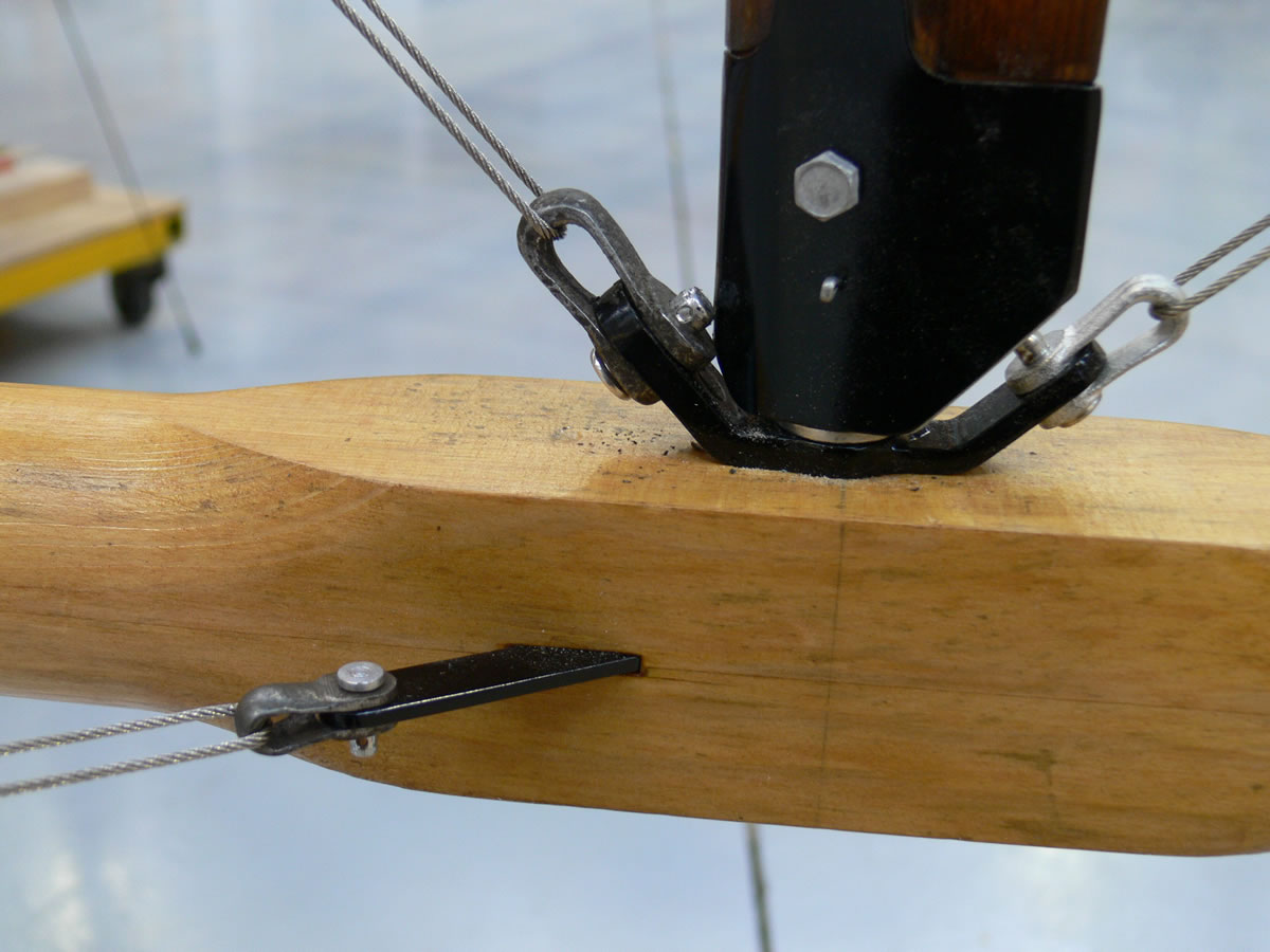 Vertical strut attach detail showing how the brace wire fitting protrudes through the outrigger and is captured internally by the strut eyebolt.