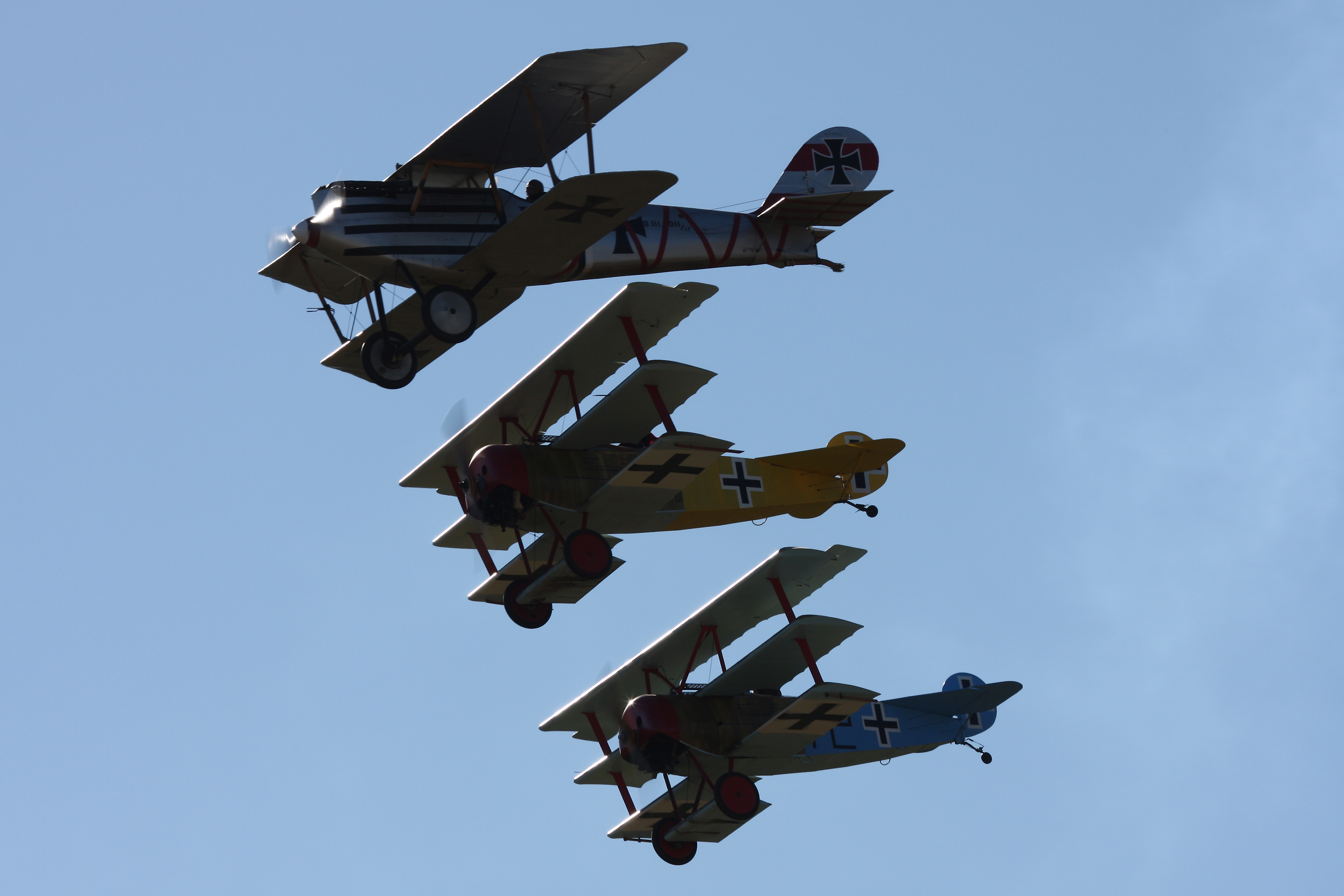 Pfalz DIII leads two Fokker Dr-1�s
