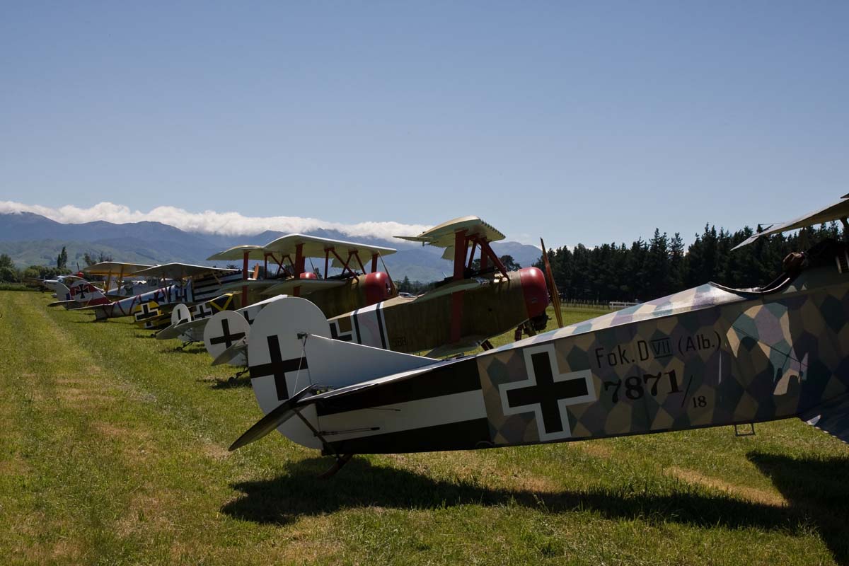 The lineup of German aircraft: Fokker D.VII (foreground), three Fokker Dr.1 Triplanes and Pfalz D.III.