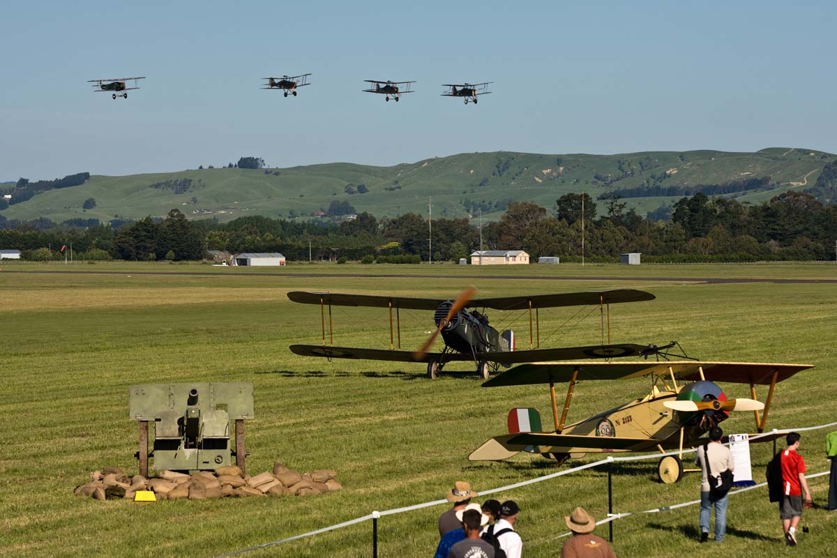 The Bristol F2.b taxis in behind the Nieuport 11 while the three SE.5a's and Fokker D.VII perform one final flypast.