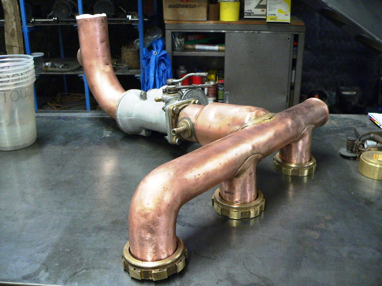 Restored copper intake assembly with carburettor