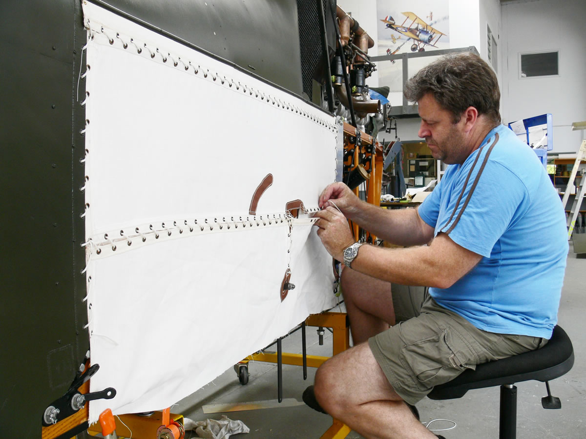 Paul Buchanan laces on the linen side panels prior to doping, note the leather reinforcements.